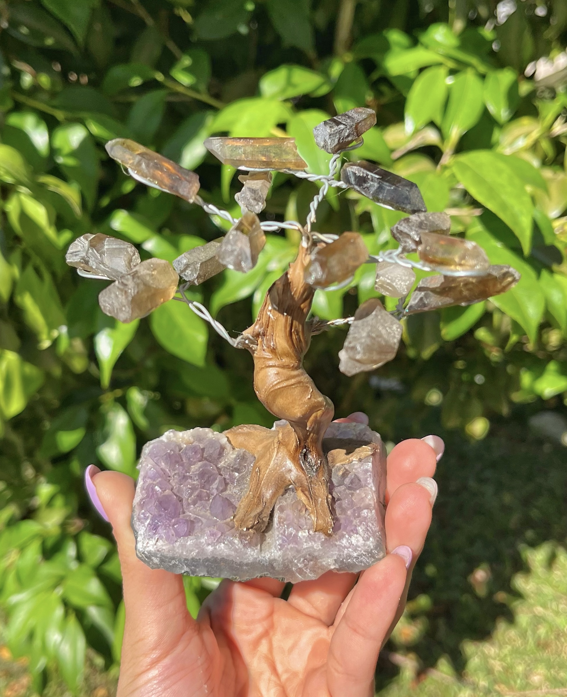 Nesta foi usado como Base a Ametista, Cristal da Espiritualidade e Fé, bloqueia e transmuta as energias negativas do ambiente. Enquanto nos galhos, foi usado o Citrino, Cristal que traz Alegria, Abundância, Abre caminhos e traz Vitalidade.