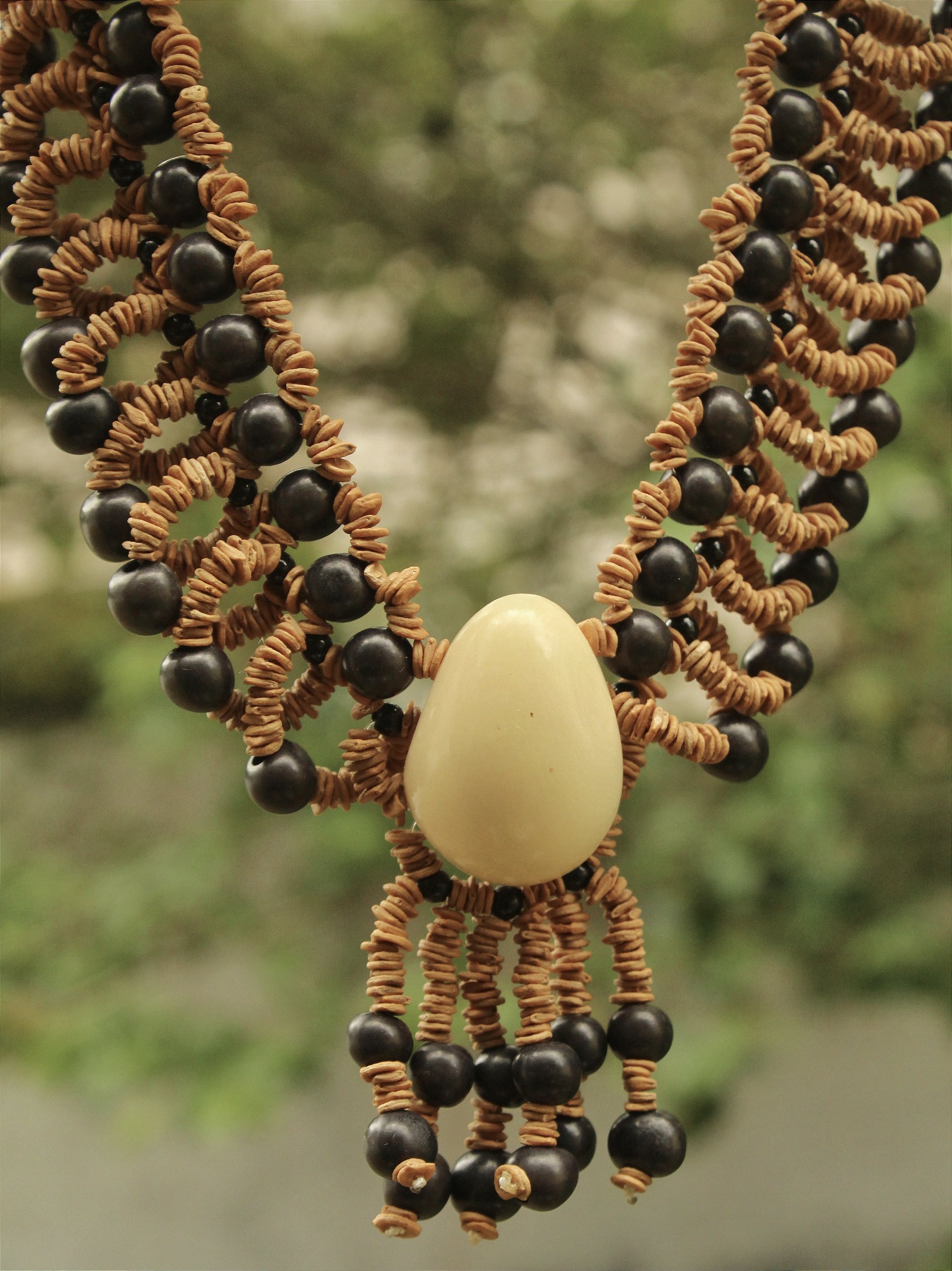 Colar cuidadosamente confeccionado a mão pelos povos originários da região do Monte Roraima, utilizando sementes naturais de Açaí e técnicas tradicionais passadas de geração em geração.