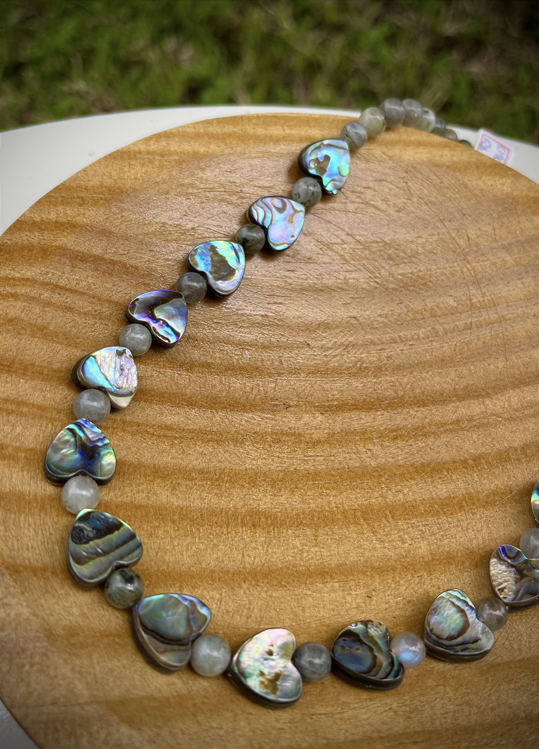 Gargantilha com Cristais Naturais de Labradorita com esfera de 6mm e a Concha Abalone em formato de coração com 1,2cm. Regulagem ajustável e detalhe de borboleta prata.