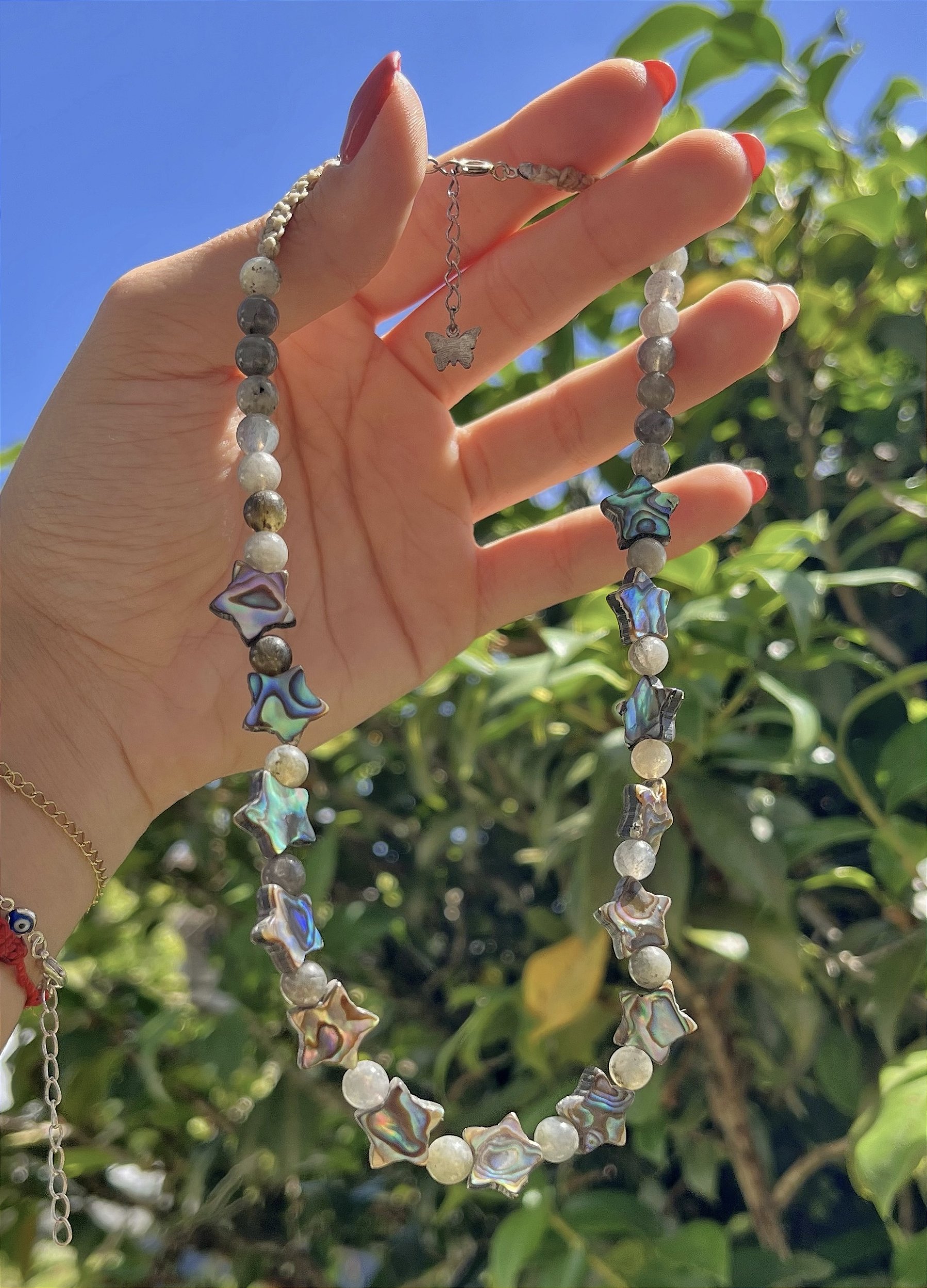 Gargantilha com Cristais Naturais de Labradorita com esferas de 6mm e Abalone em formato de estrela com 1,2cm. Regulagem ajustável e detalhe de borboleta prata.