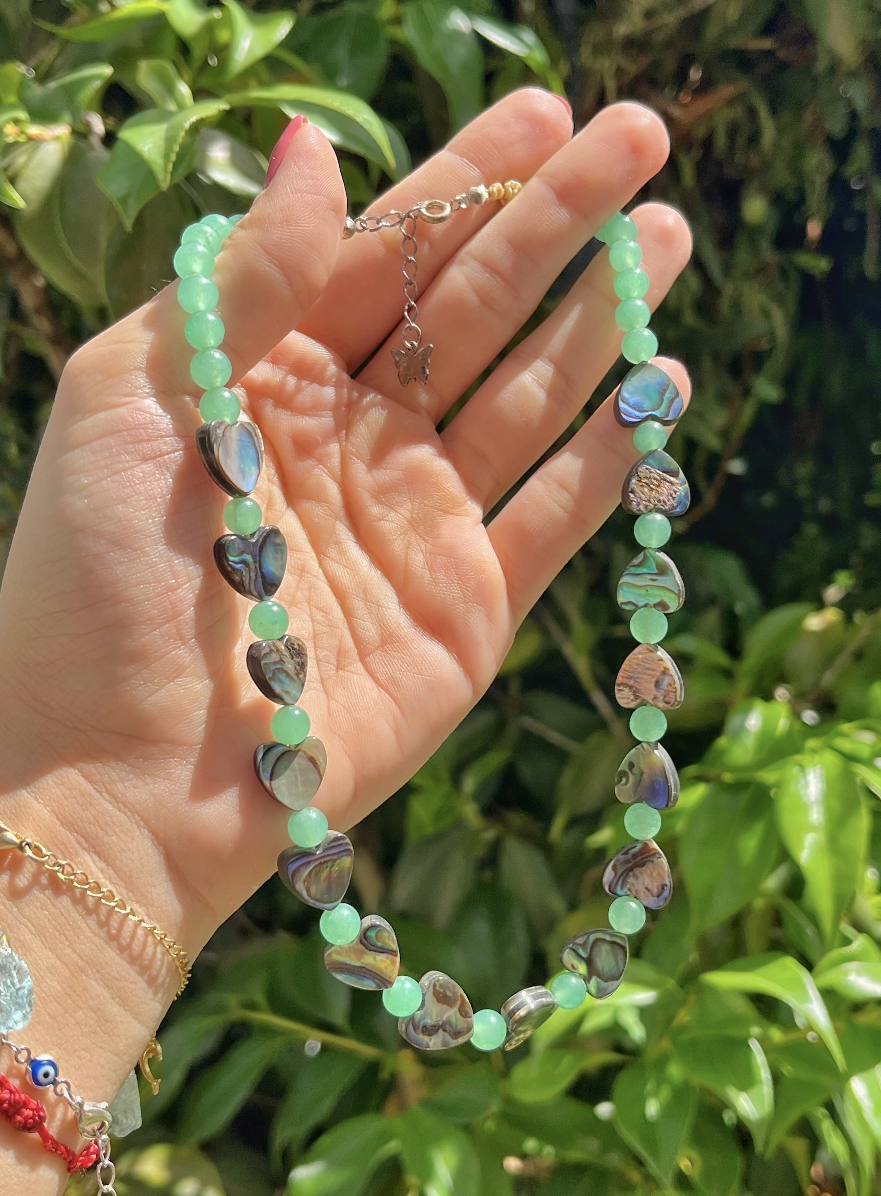 Gargantilha com Cristais Naturais de Quartzo Verde, com esferas de 6mm e a Concha Abalone em formato de coração, com 1,5 a 2cm. Com regulagem e detalhe de borboleta prata.