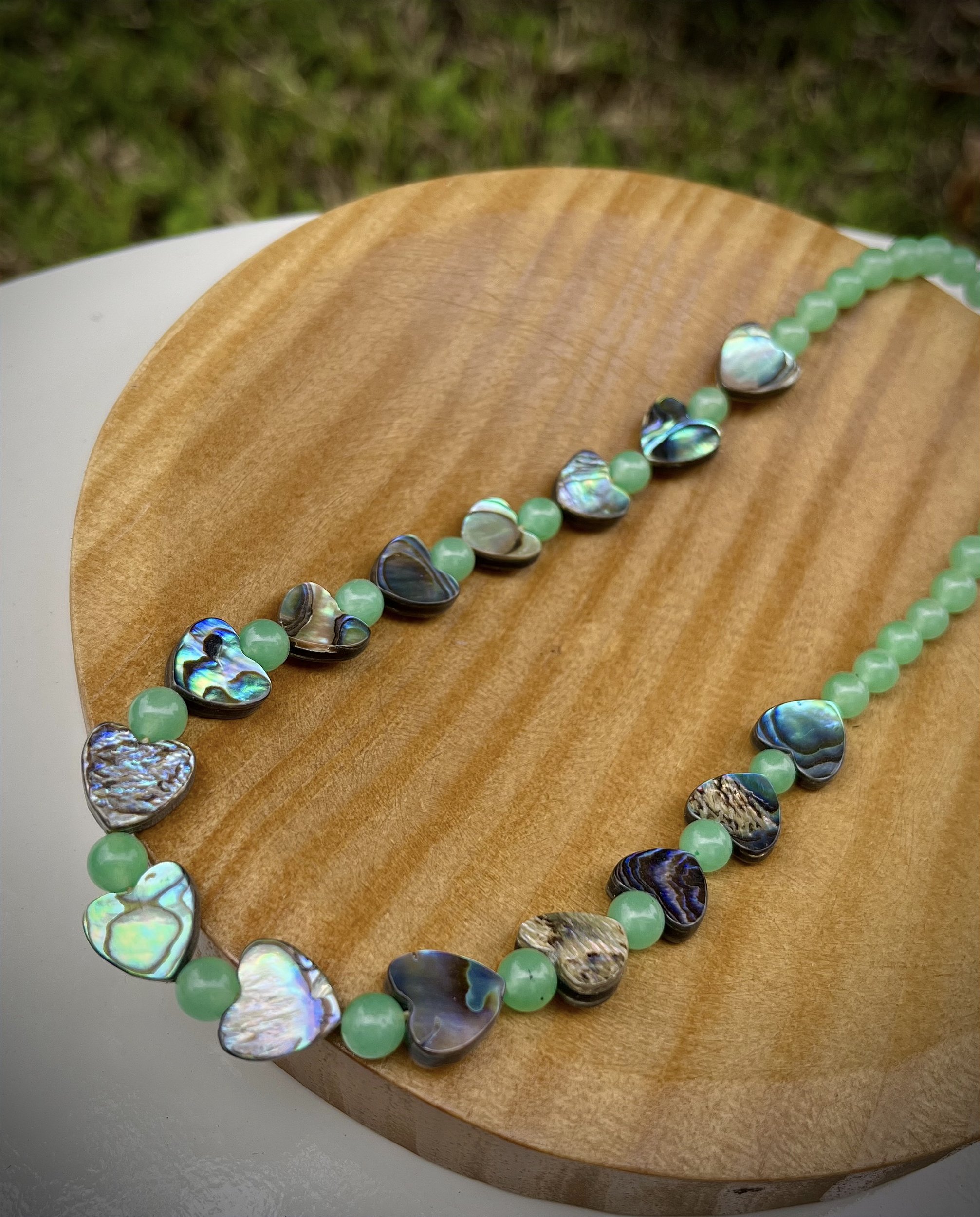 Gargantilha com Cristais Naturais de Quartzo Verde, com esferas de 6mm e a Concha Abalone em formato de coração, com 1,2cm. Com regulagem e detalhe de borboleta prata.