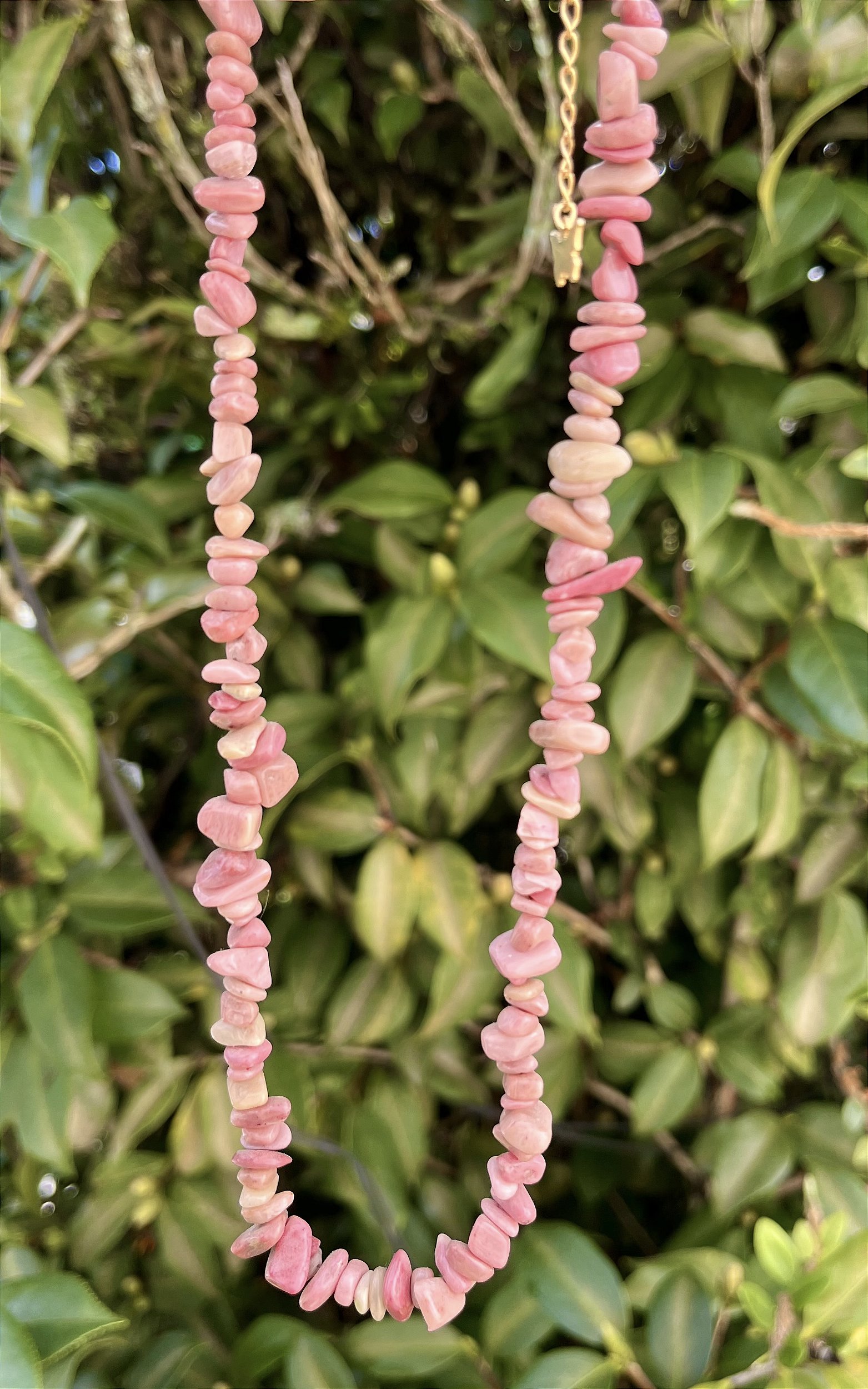 Colar com Cristais Naturais de Rodonita com correntinha dourada e detalhe de borboleta.