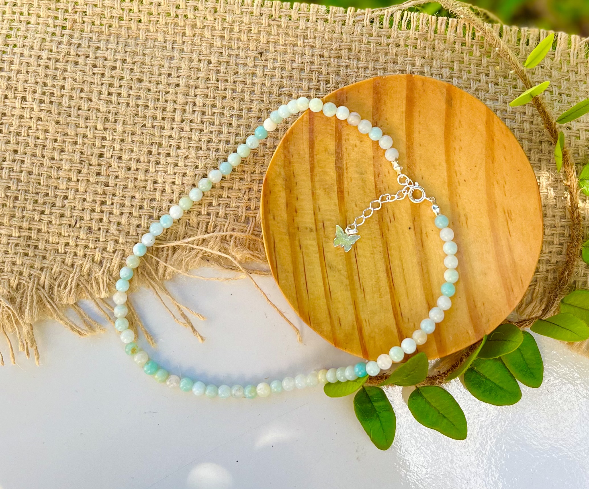 Gargantilha feita com Cristais Naturais de Amazonita. Com regulagem ajustável banhada a Prata e detalhe de borboleta na pontinha. Esferas de 4mm.