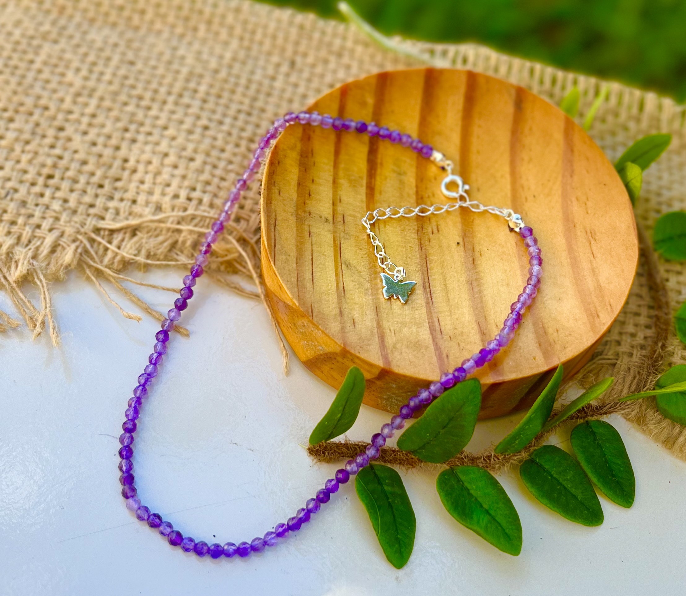 Gargantilha feita com Cristais Naturais de Ametista. Com regulagem ajustável banhada a Prata e detalhe de borboleta na pontinha. Com esferas de 3mm.