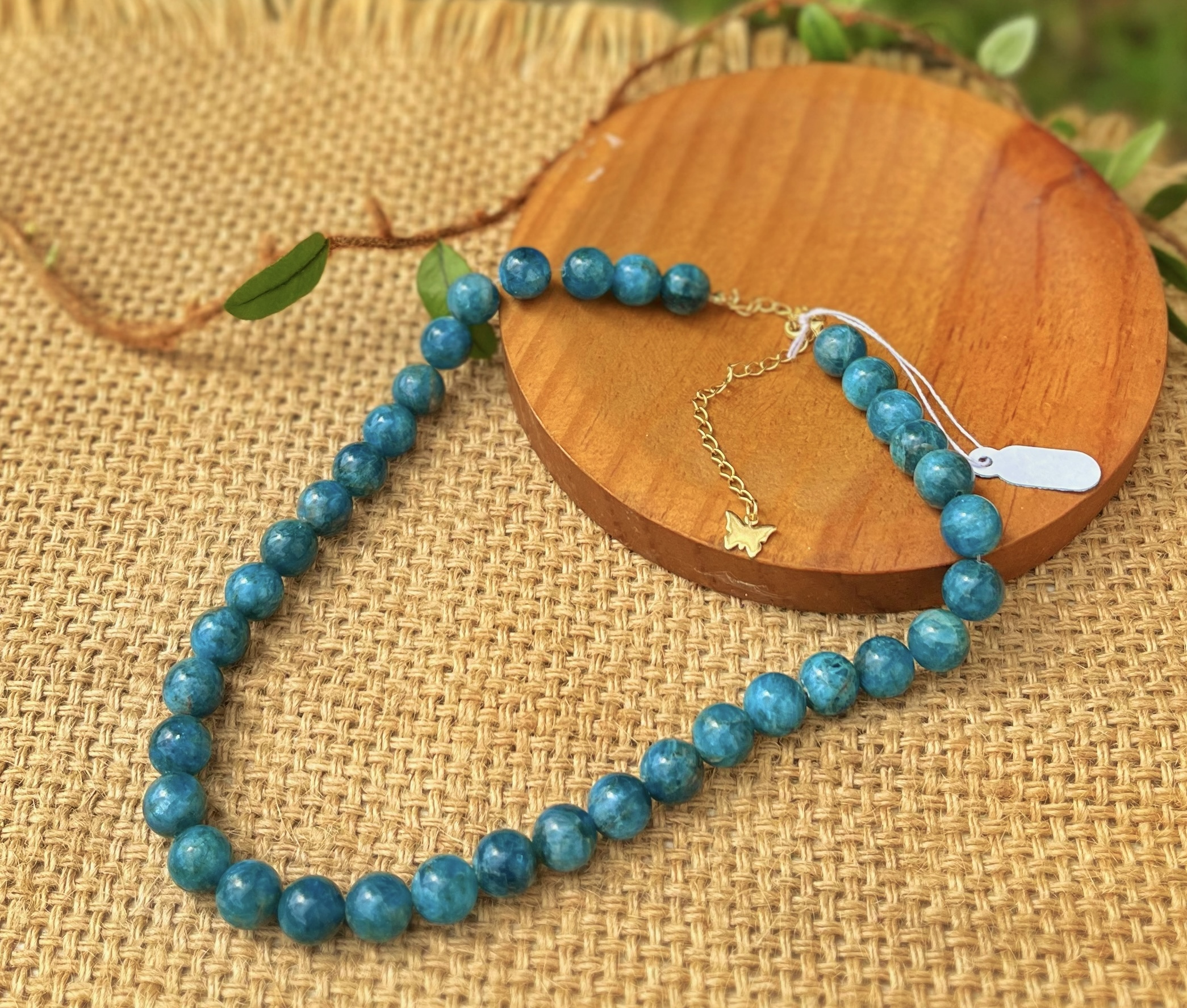 Gargantilha feita com Cristais Naturais de Apatita Azul. Possui regulagem ajustável banhada a Ouro e detalhe de borboleta na pontinha! Esferas de 10mm.