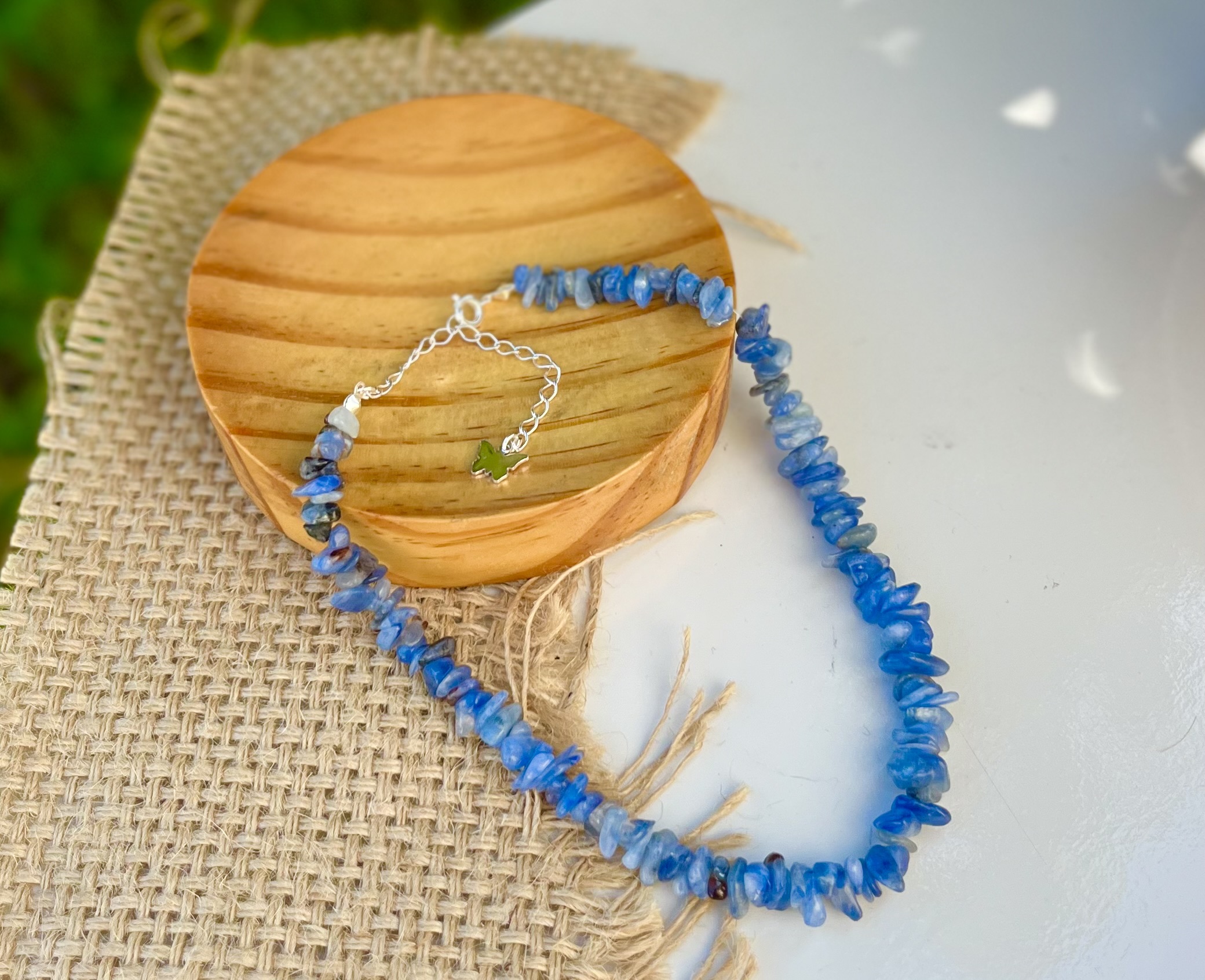 Gargantilha feita com Cristais Naturais de Cianita Azul. Com regulagem ajustável banhada a prata e detalhe de borboleta na pontinha.