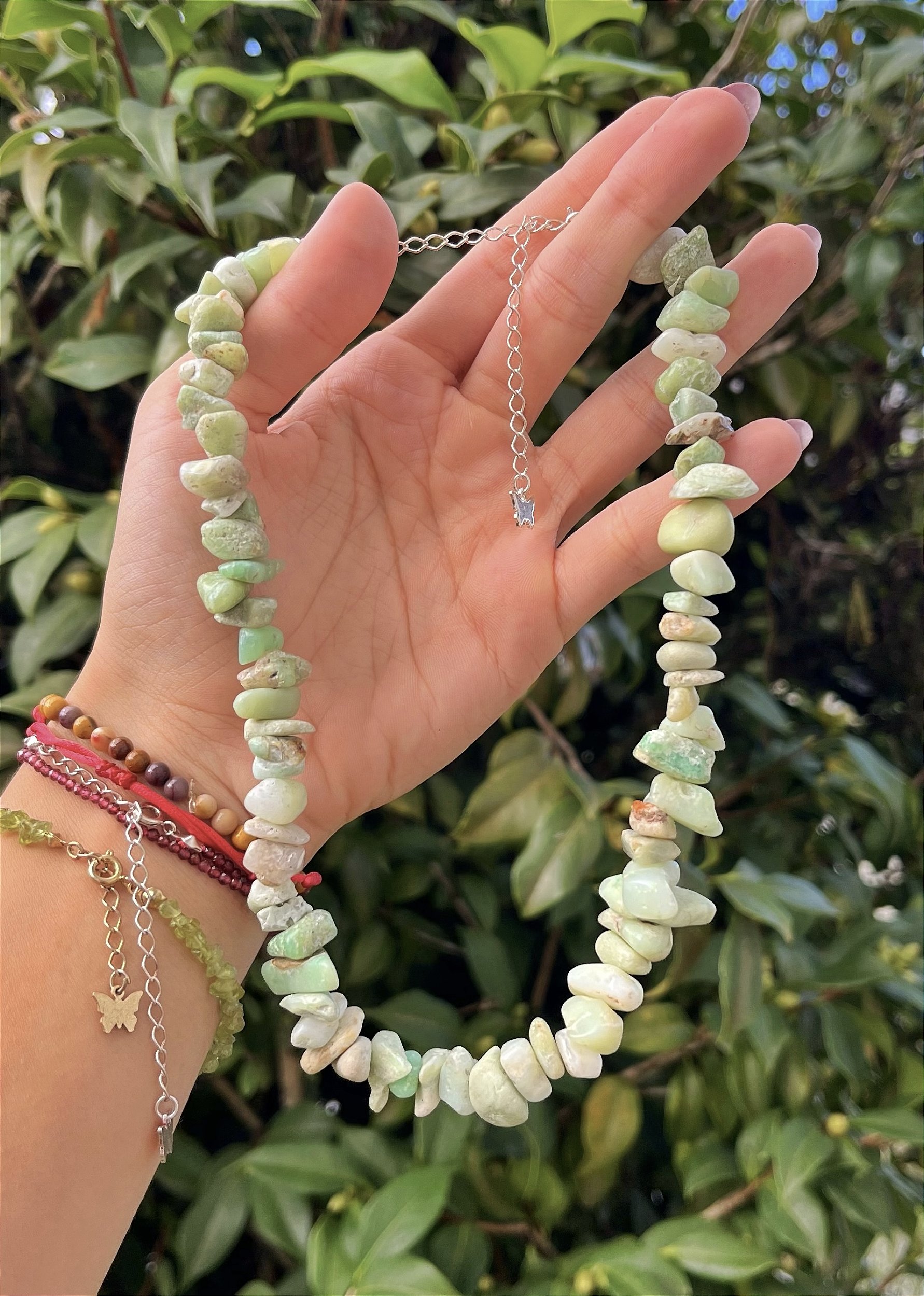 Gargantilha feita com Cristais Naturais de Crisoprásio. Possui regulagem ajustável banhada a Prata, com detalhe de borboleta na pontinha!