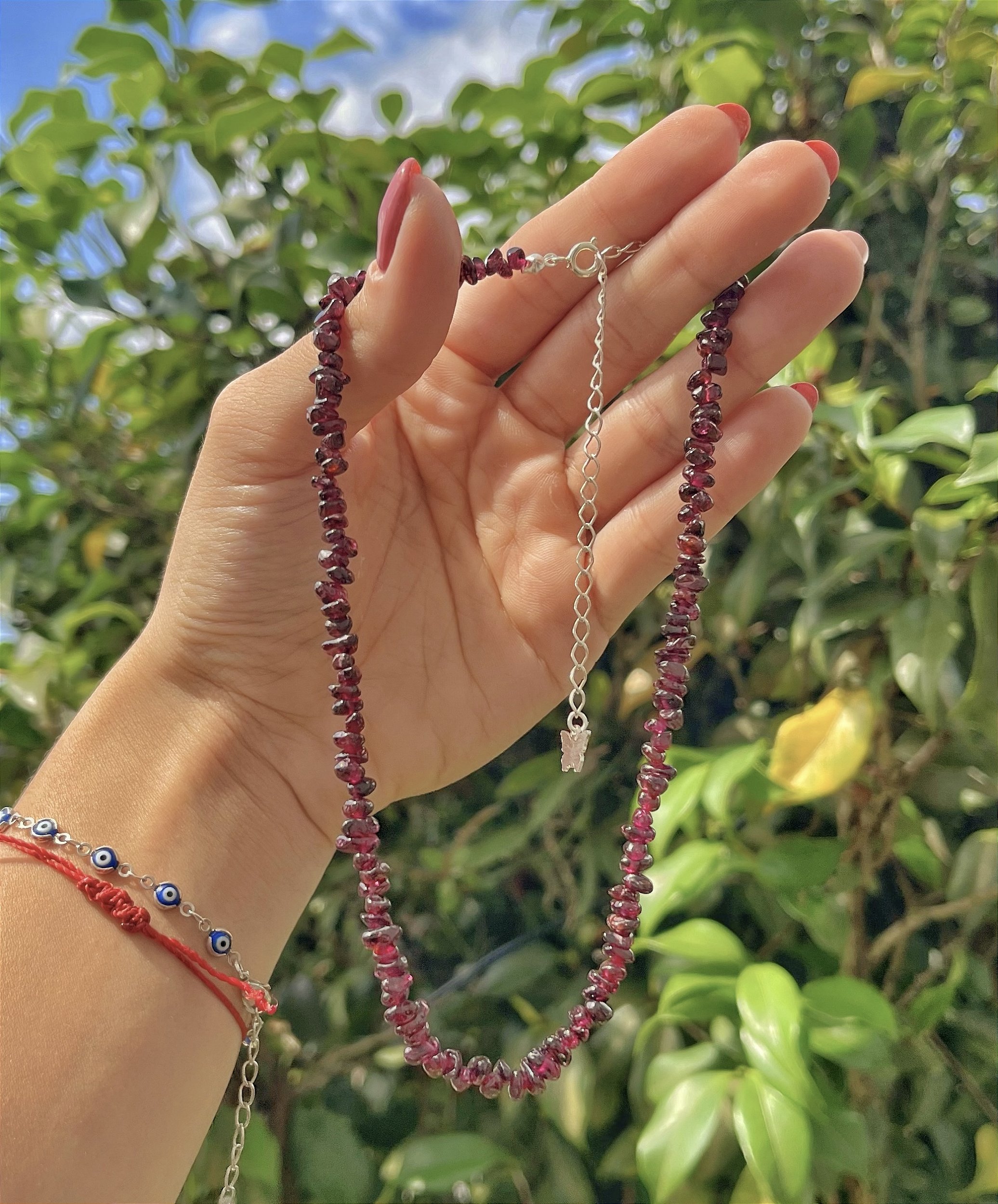 Gargantilha feita com Cristais Naturais de Granada Vermelha. Com regulagem ajustável e detalhe de borboleta na pontinha banhada a prata.