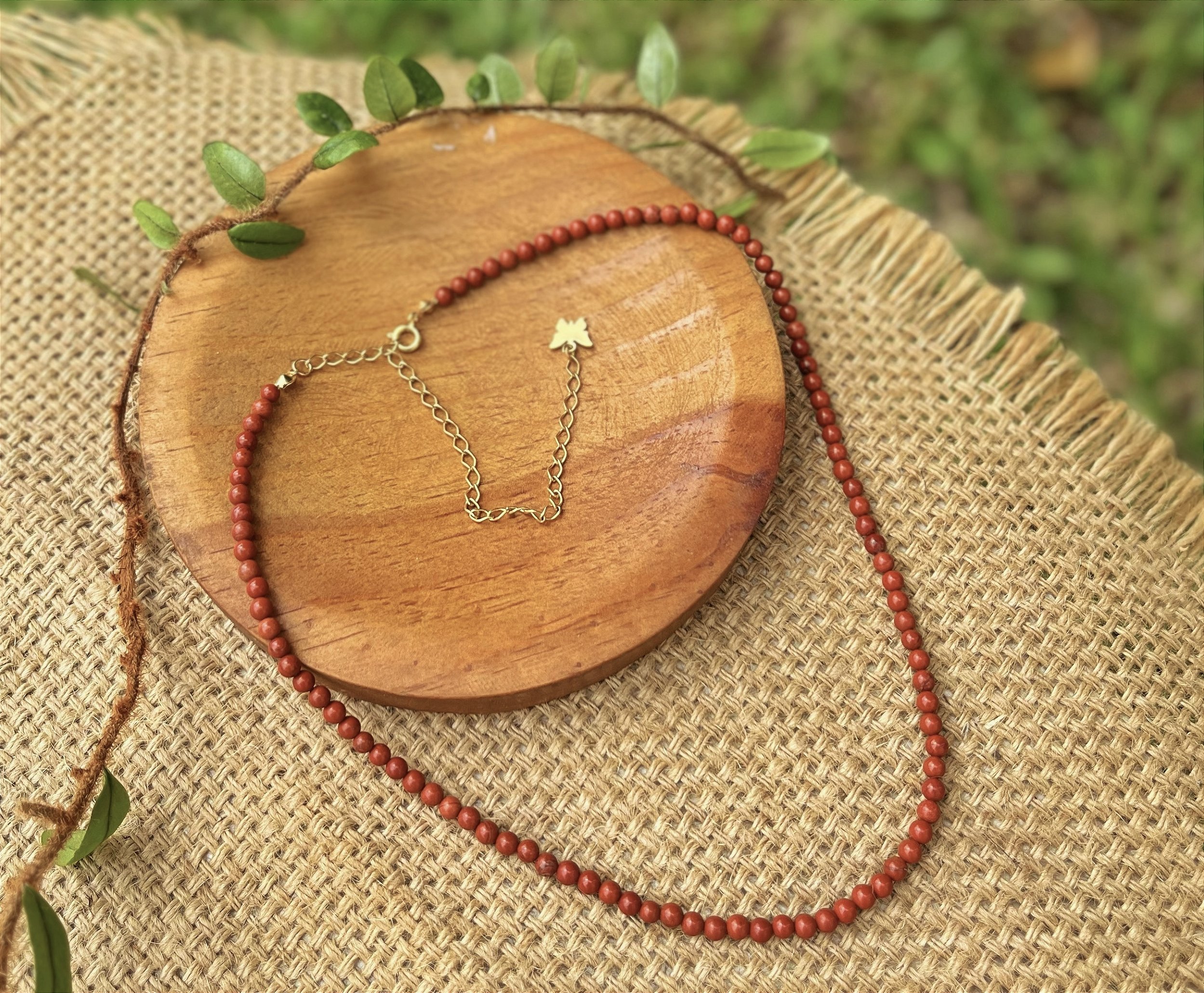 Gargantilha feita com Cristais Naturais de Jaspe Vermelha. Possui regulagem ajustável banhada a Ouro e detalhe de borboleta na pontinha! Com esferas de 4mm.