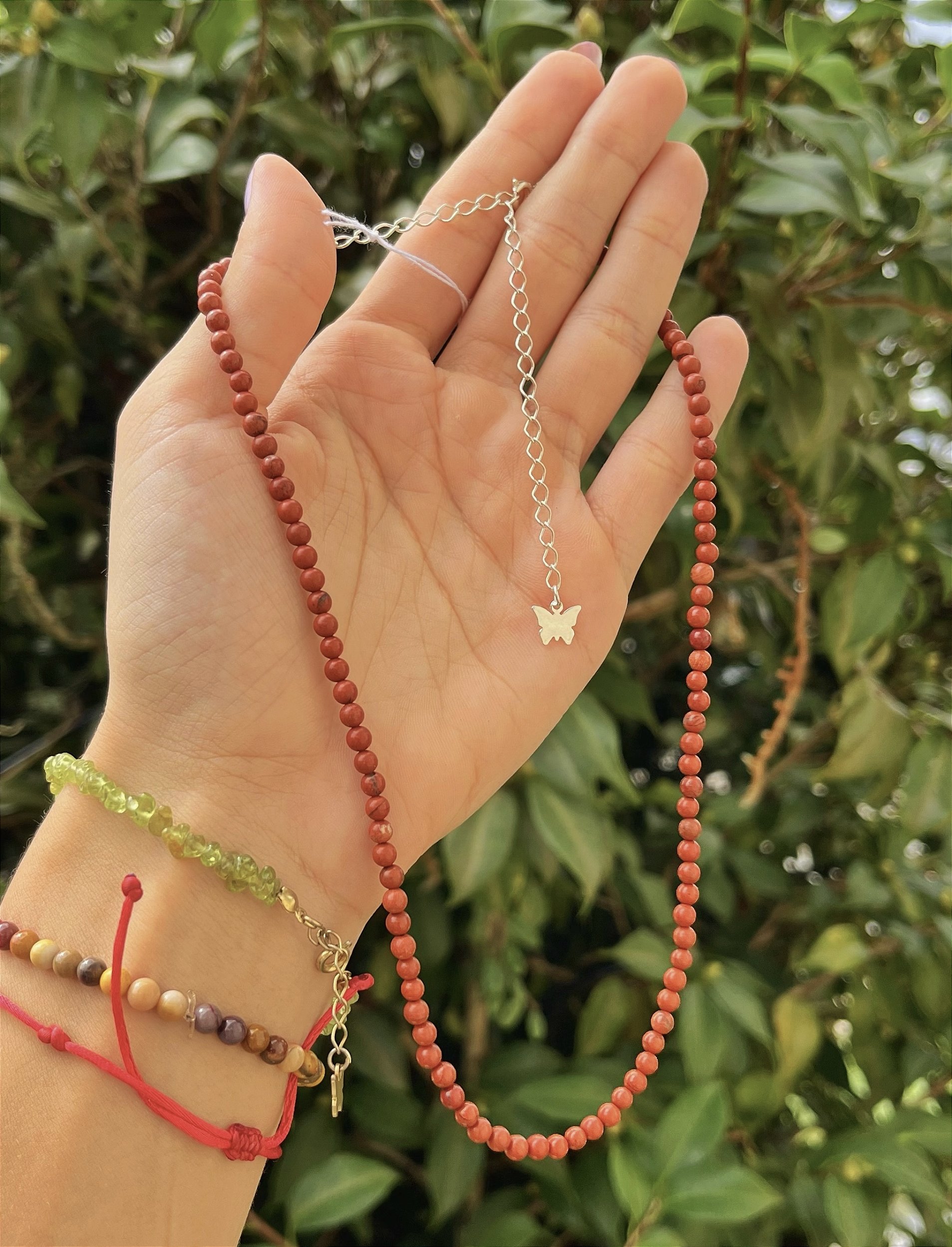 Gargantilha feita com Cristais Naturais de Jaspe Vermelha. Possui regulagem ajustável banhada a Prata e detalhe de borboleta na pontinha! Com esferas de 4mm.