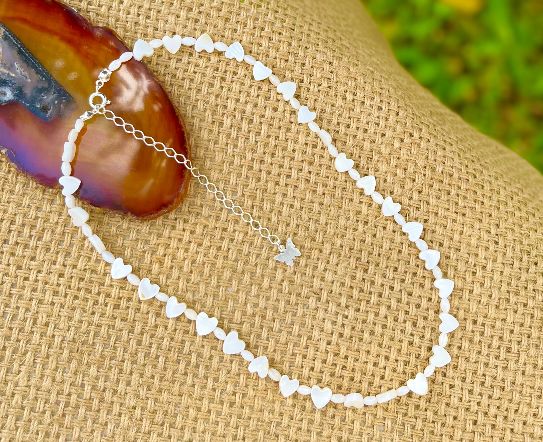 Gargantilha com esferas Naturais de Madrepérola. Com regulagem ajustável e detalhe de borboleta prata. Super delicada com esferas alternadas em formato de coração (6mm cada) e esferas arredondadas (3mm a 5mm).