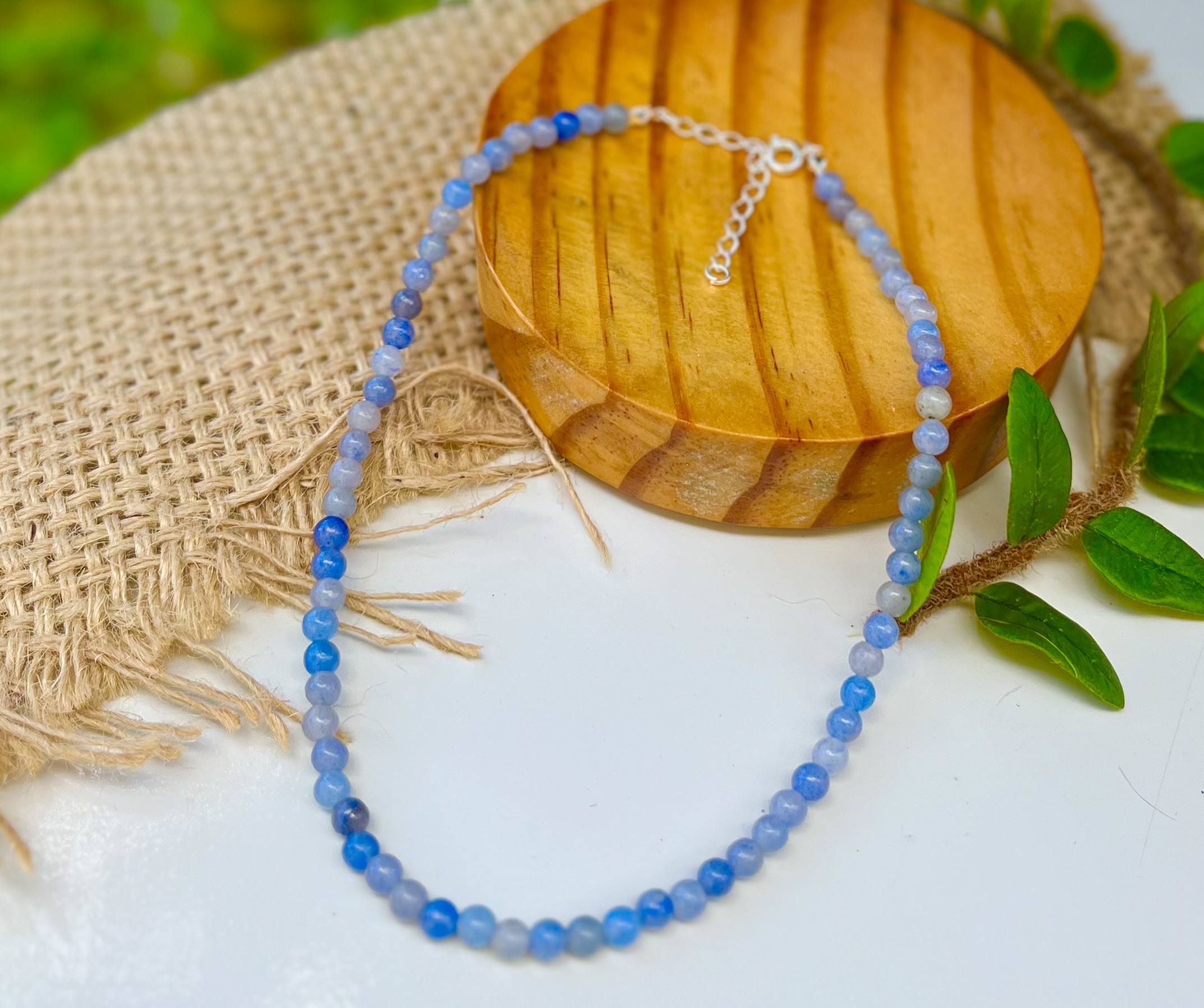 Gargantilha feita com Cristais Naturais de Quartzo Azul. Possui regulagem ajustável banhada a prata. Esferas de 4mm.