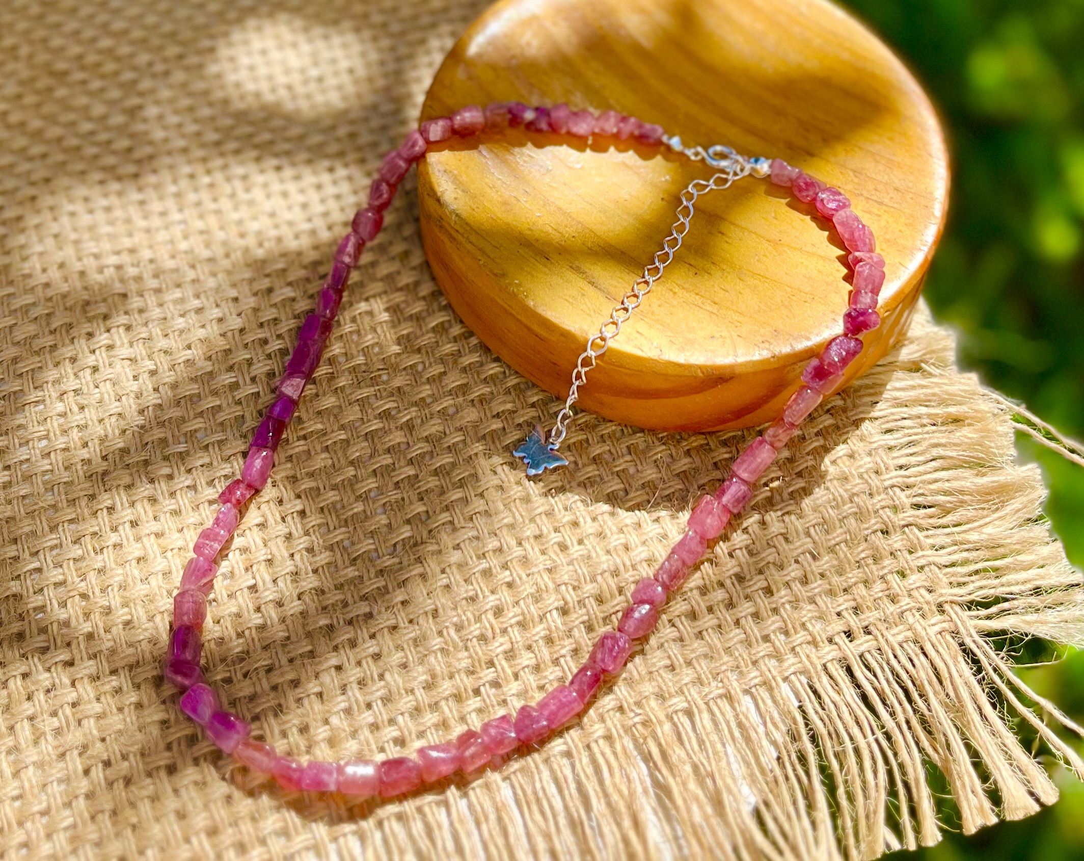 Gargantilha com Cristais Naturais de Turmalina Rosa. Com regulagem ajustável e detalhe de borboleta prata.