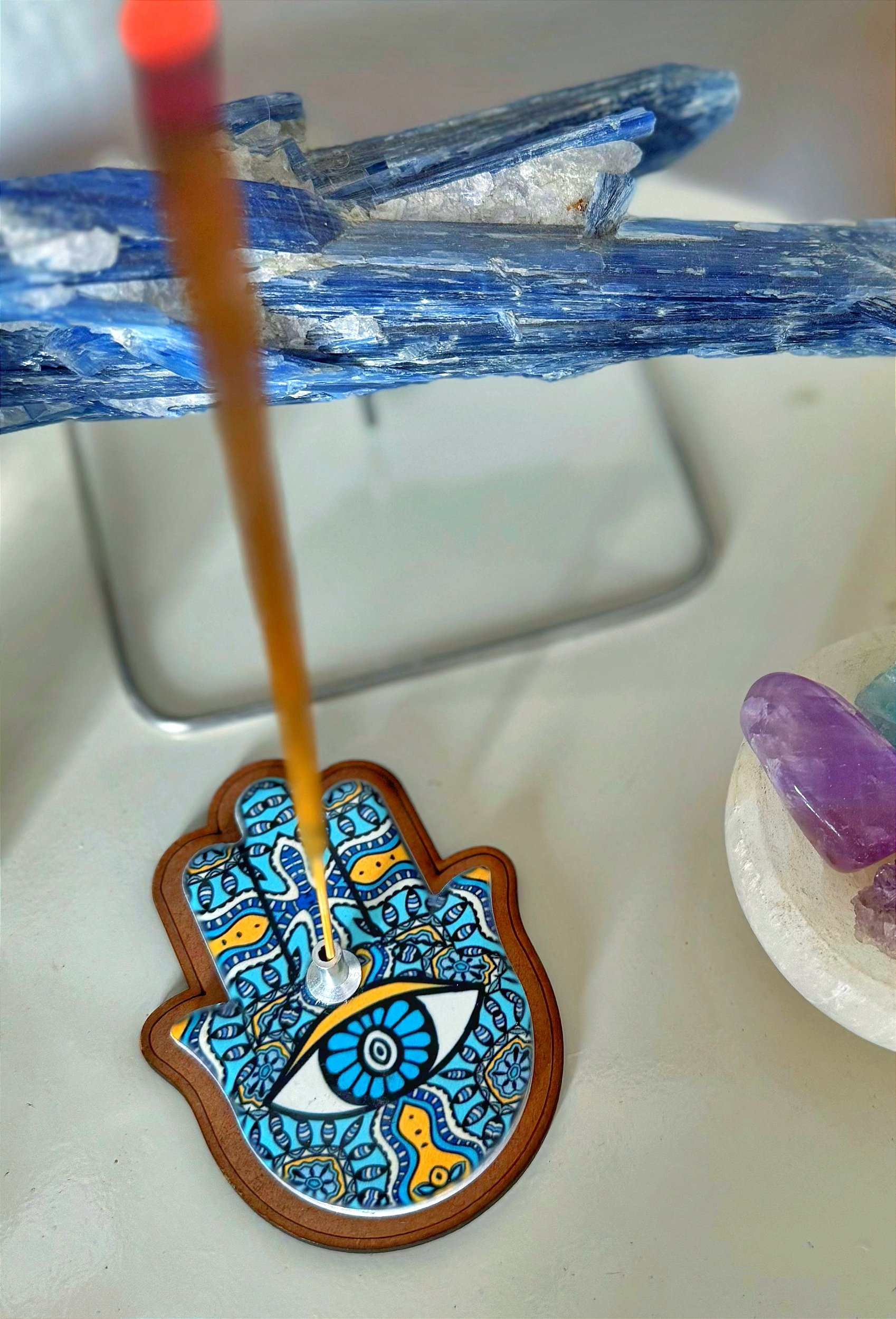 Inspirado no símbolo da Mão de Fátima, este incensário representa proteção espiritual e afastamento de energias negativas. O olho protetor no centro reforça a energia de proteção, ajudando a harmonizar e purificar o ambiente.