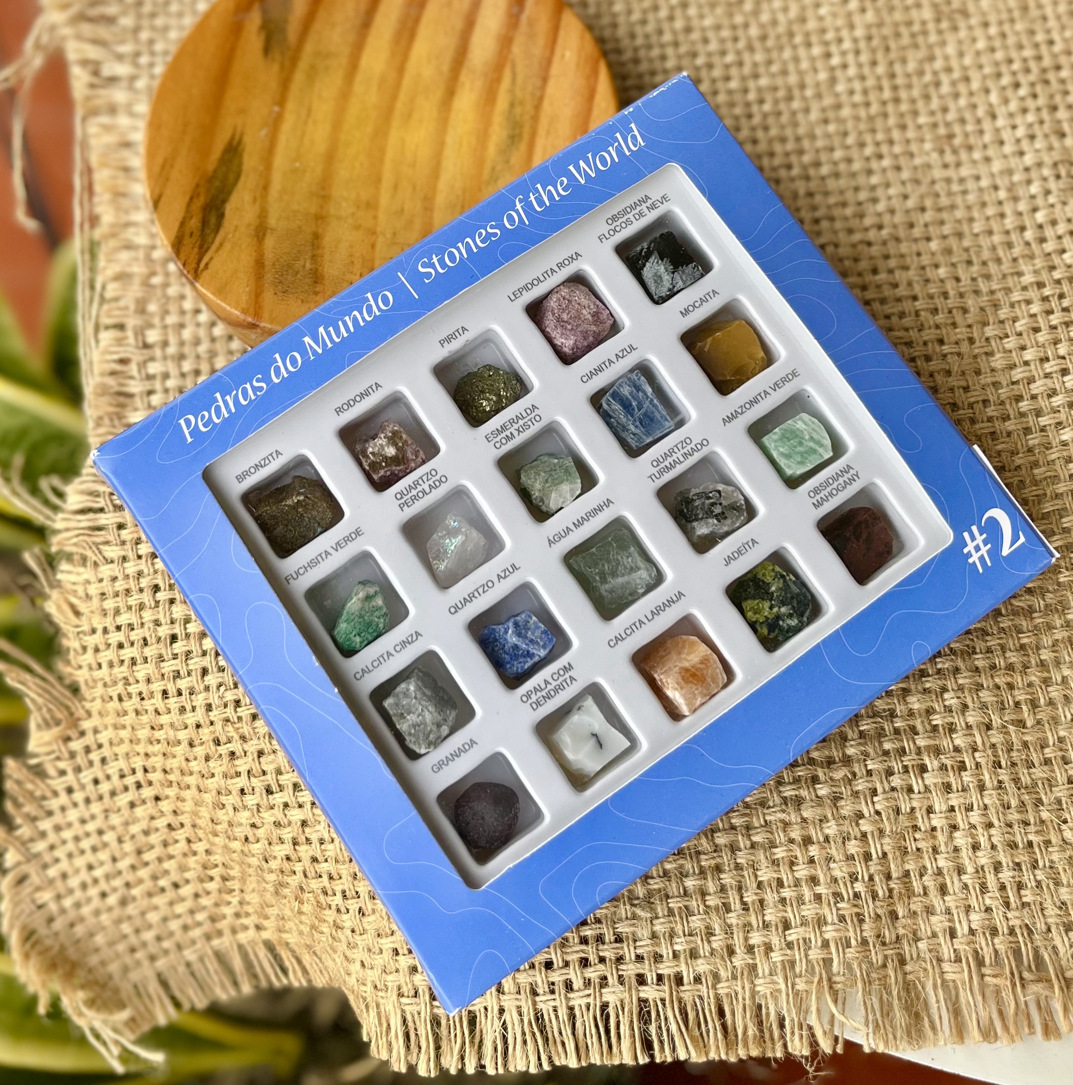 Água Marinha, Amazonita Verde, Bronzita, Calcita Cinza, Calcita Laranja, Cianita Azul, Esmeralda com Xisto, Fuchsita Verde, Granada, Jadeíta, Lepidolita Roxa, Mocaita, Obsidiana Floco de Neve, Obsidiana Mahogany, Opala com Dendrita, Pirita, Quartzo Azul, Quartzo Branco Perolado, Quartzo Turmalinado e Rodonita.