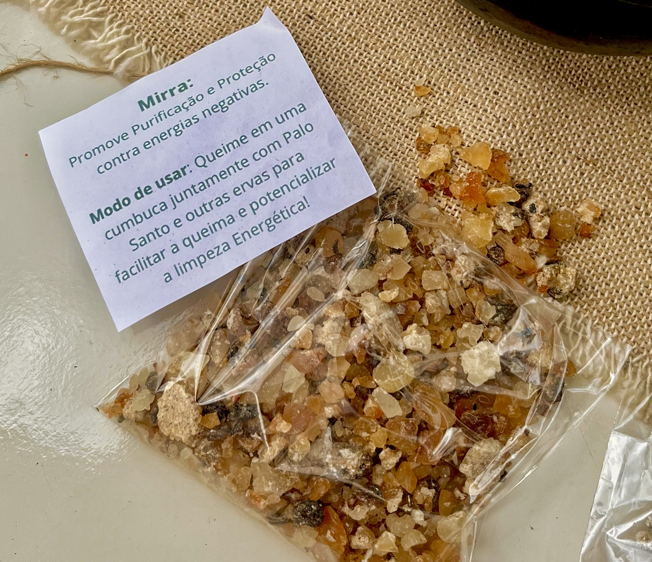 Pacote com 50g de Mirra. Promove purificação e proteção contra energias negativas.