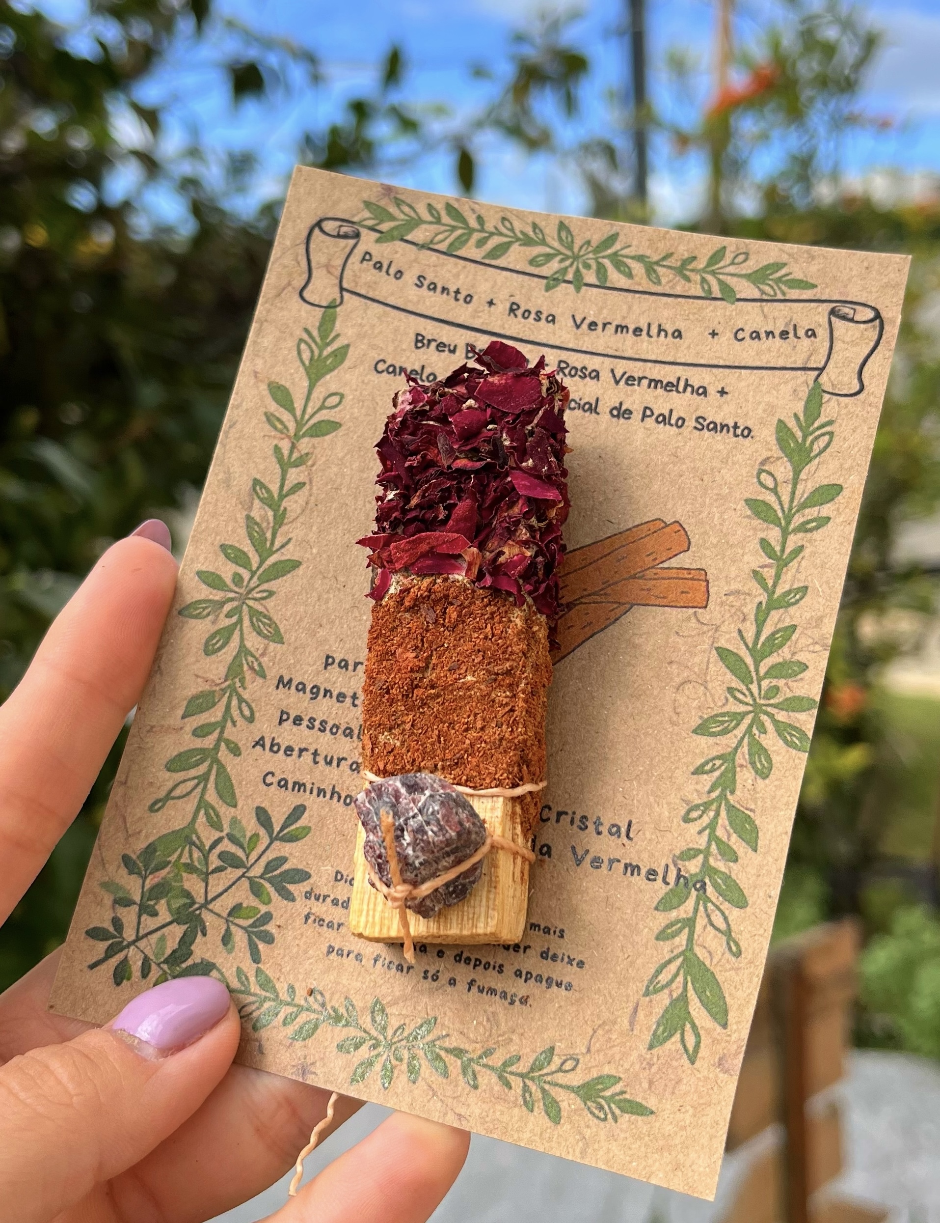 Palo Santo Imantado feito artesanalmente pela Su aqui na Arte Natural, com Breu Branco, Rosa Vermelha, Canela e Óleo Essencial de Palo Santo para Magnetismo Pessoal e Abertura de Caminhos. Acompanha Cristal de Granada Vermelha, para potencializar ainda mais essa Energia!