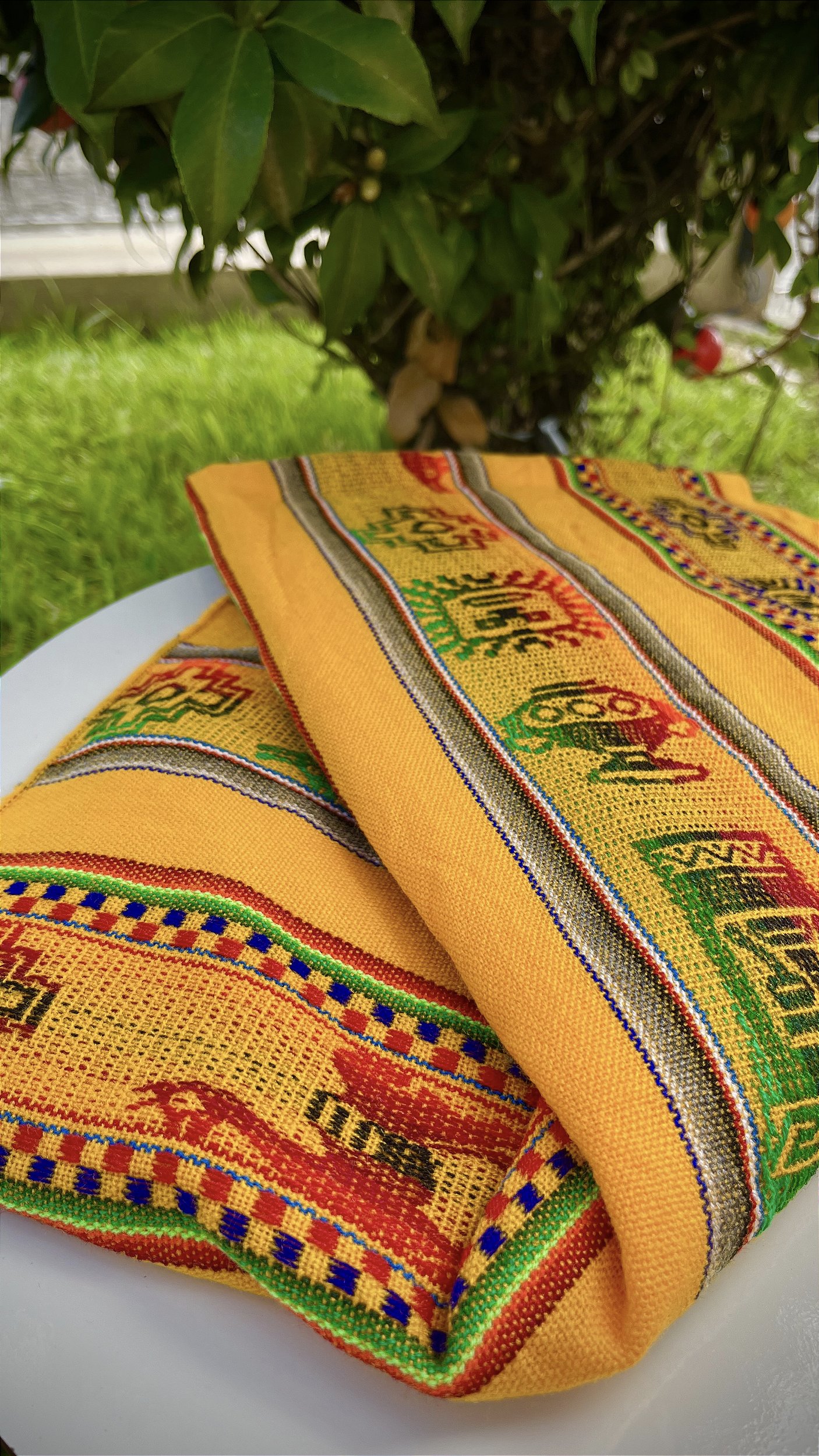 Pano Peruano Amarelo rico em detalhes e cores vibrantes nos tons de vermelho, marrom, verde e azul.
