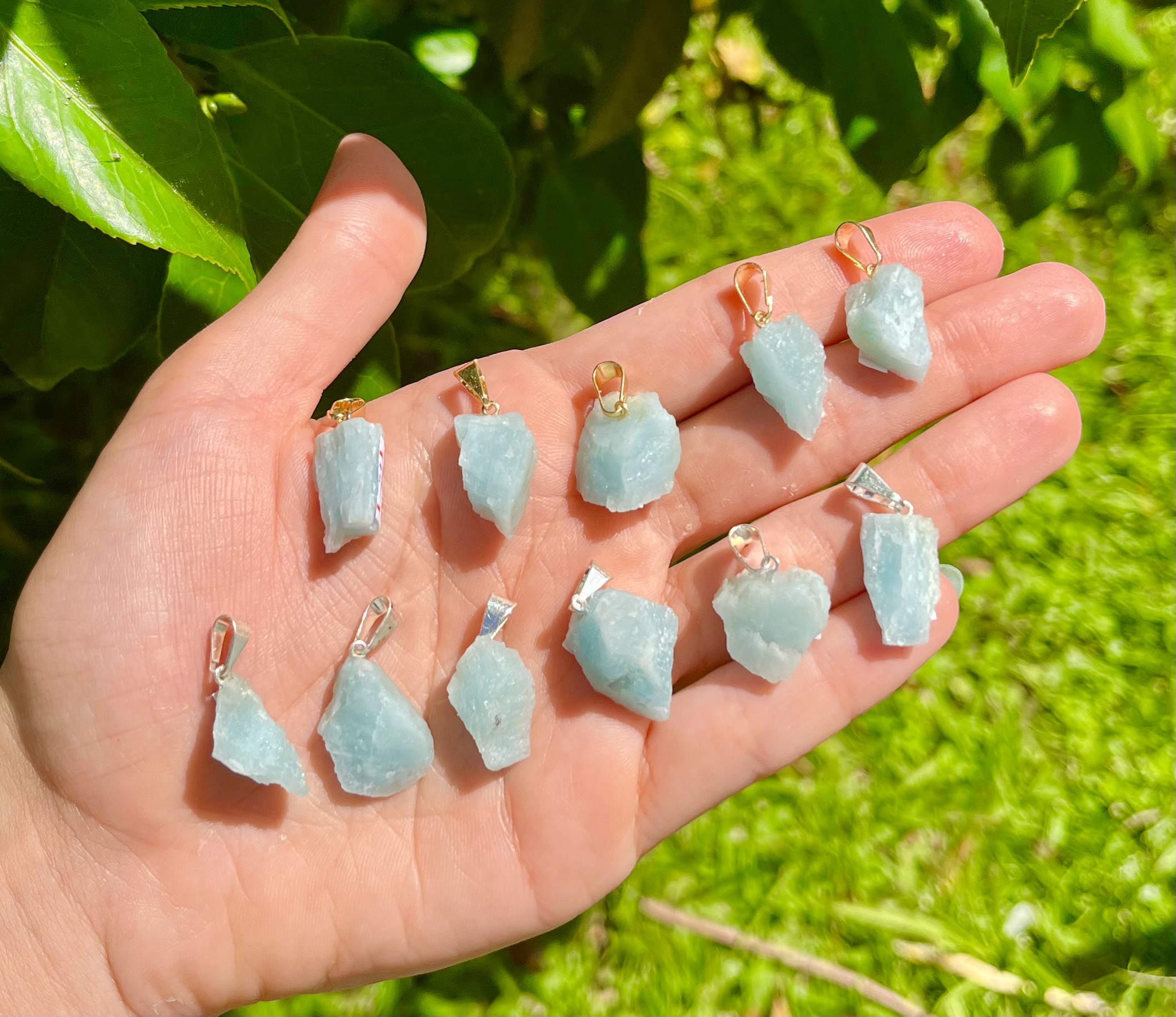 Pingente com Cristal Natural de Água Marinha! Escreva na descrição do pedido se você prefere o pingente dourado ou prata, ou iremos separar conforme nossa intuição! Tem em torno de 1cm a 2cm.