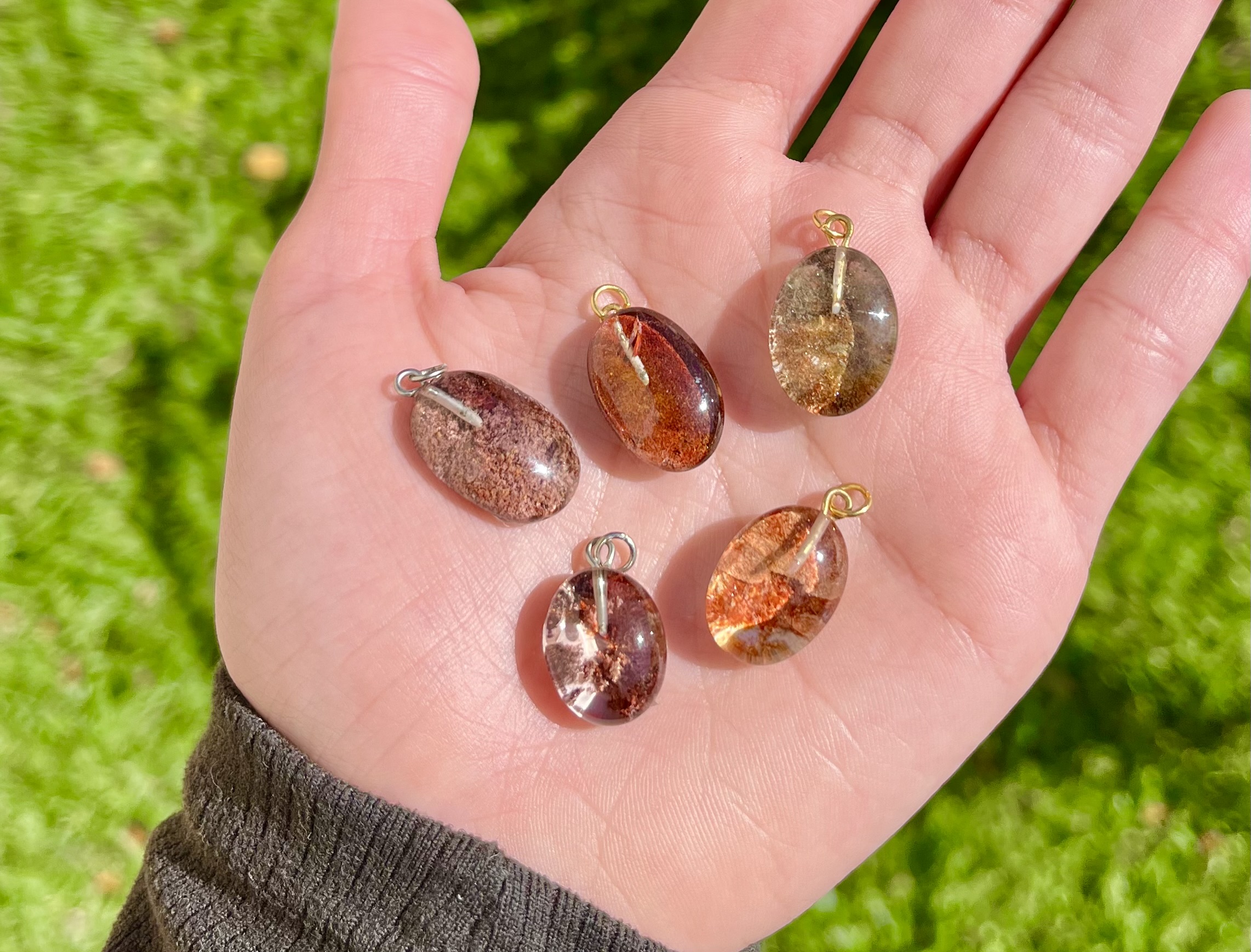 Pingente lapidado com Cristal Natural de Lodolita. Tem em média 1cm a 1,5cm, podendo ter uma variação de tamanho e cor como mostrado nas fotos! Na opção prata ou dourada, caso prefira algum específico escreva na descrição do pedido.