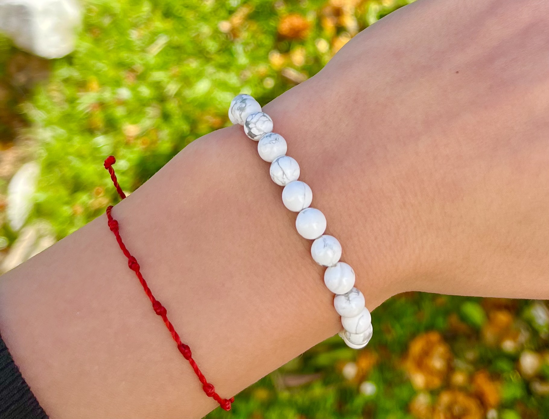 Pulseira com Cristais Naturais de Howlita Branca. Com elástico super reforçado e confortável. Esferas de 6mm.