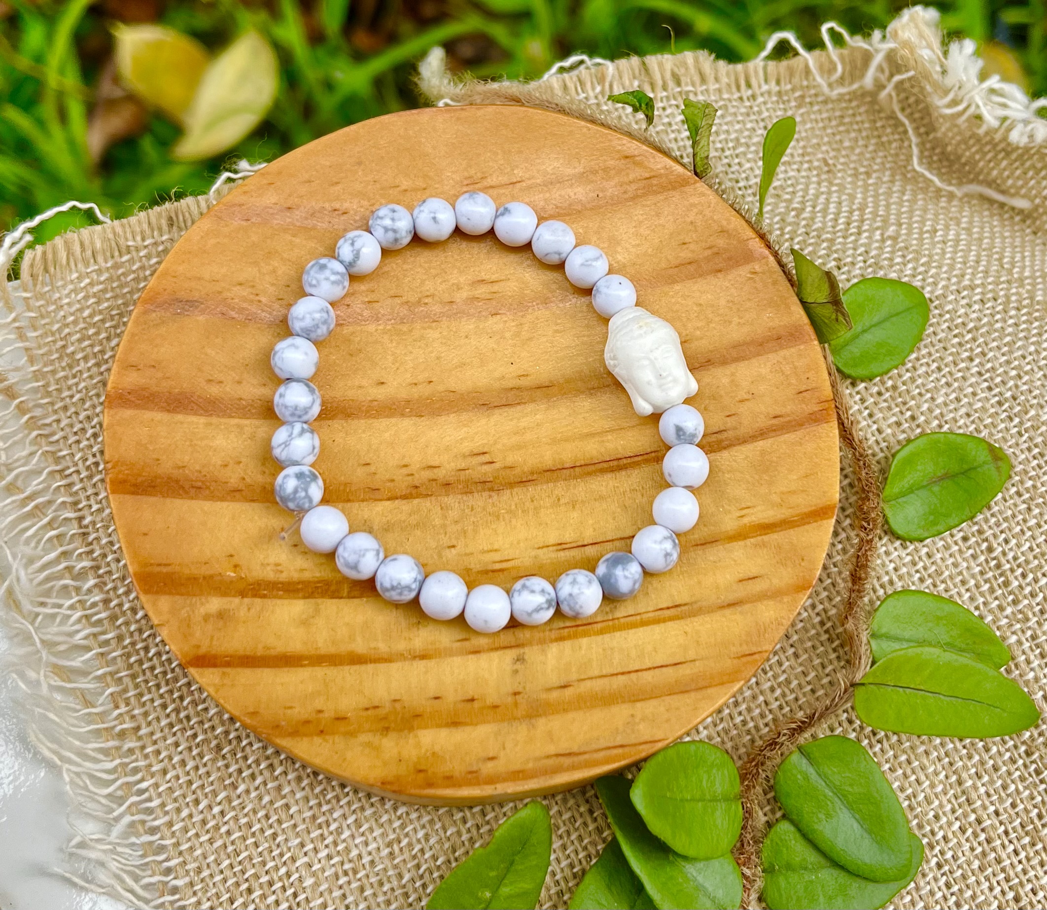Pulseira feita com Cristais Naturais de Howlita Branca e detalhe de Buda ao meio.