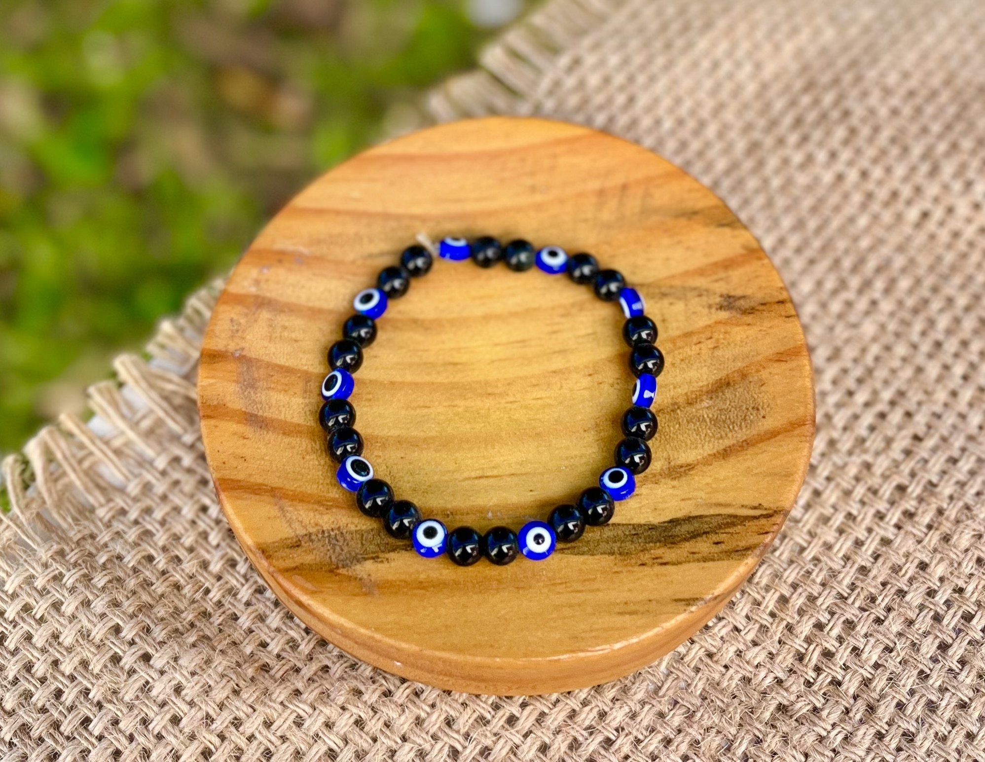 Pulseira com Cristais Naturais de Obsidiana Preta + Olho Grego. Com esferas de 6mm. Com elástico super reforçado e confortável.