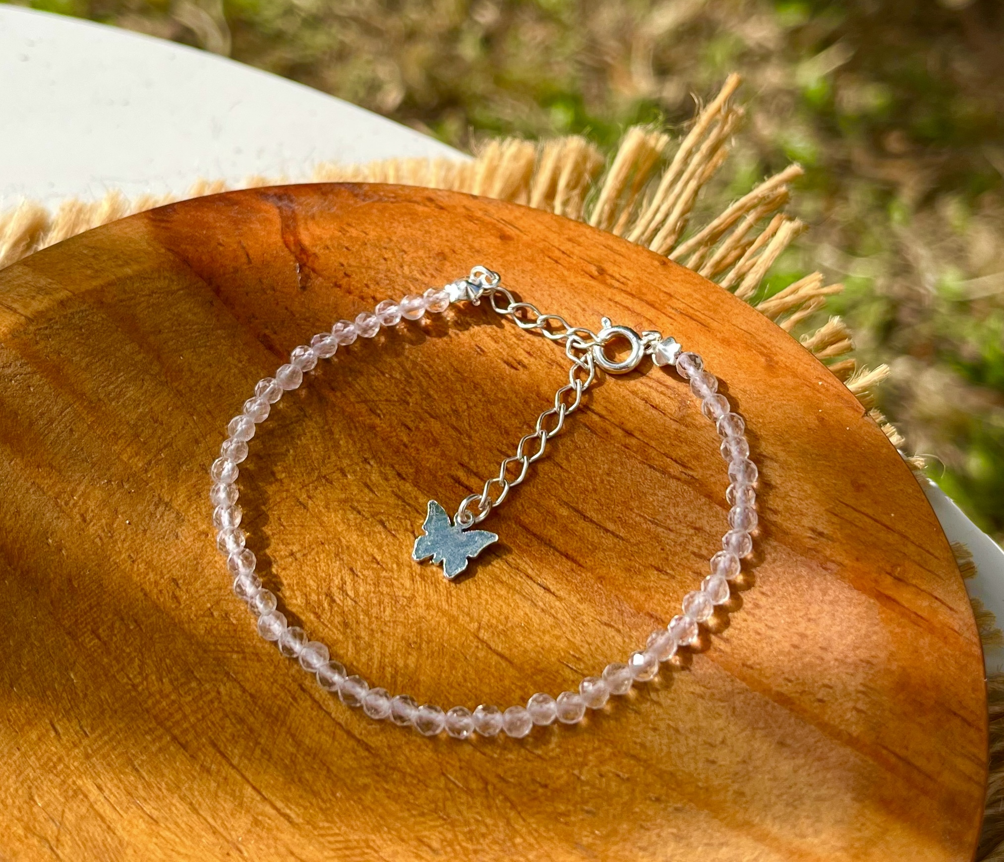 Pulseira super delicada feita com Cristais Naturais de Quartzo Cristal no tamanho de 3mm. Possui regulagem ajustável banhada a prata e detalhe de borboleta na pontinha!