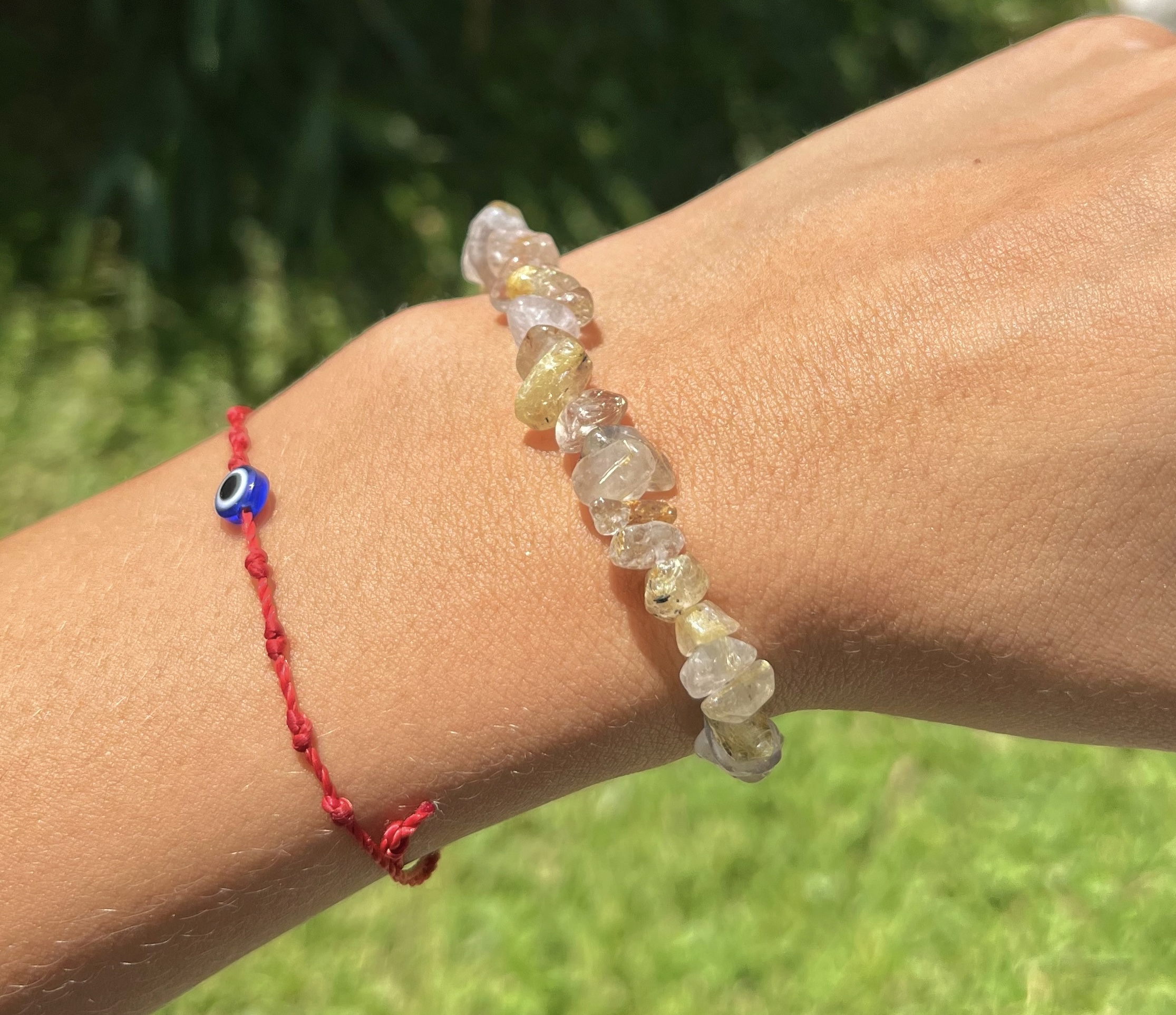 Pulseira de elástico com Cristais Naturais de Quartzo Rutilado. Com elástico super resistente e confortável. Com Rútilos Ouro.