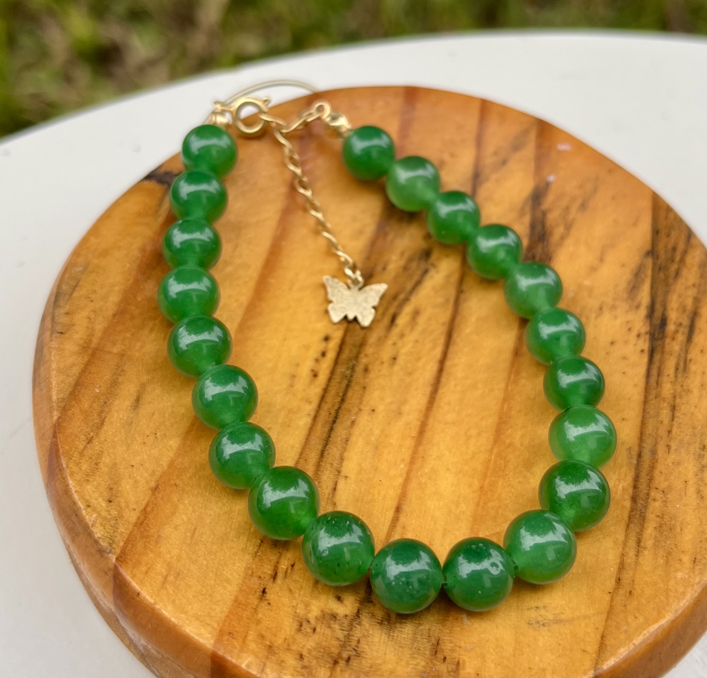 Pulseira de Quartzo Verde dourada com esferas de 8mm e detalhe de borboleta.