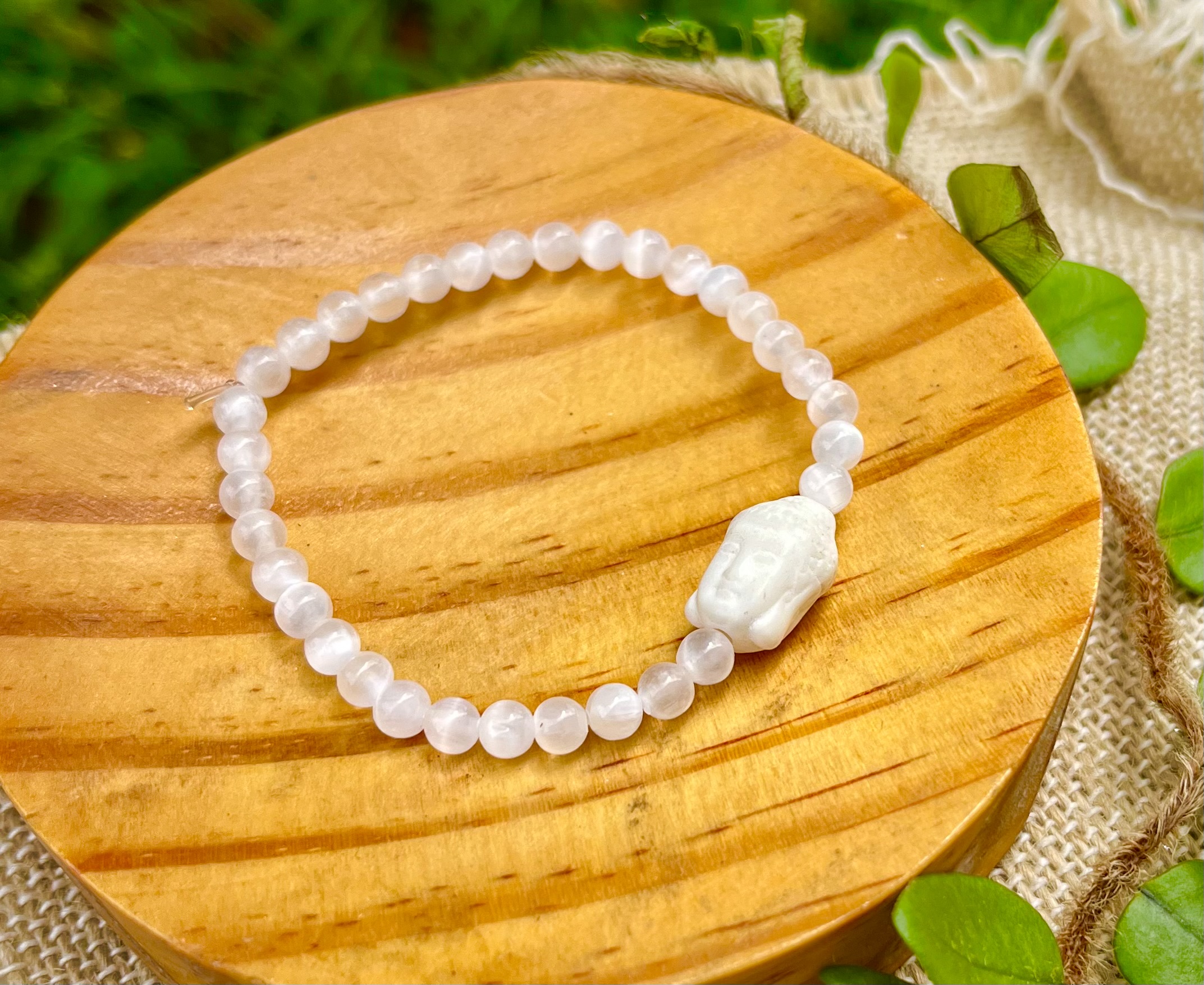 Pulseira feita com Cristais Naturais de Selenita Branca e detalhe de Buda ao meio.