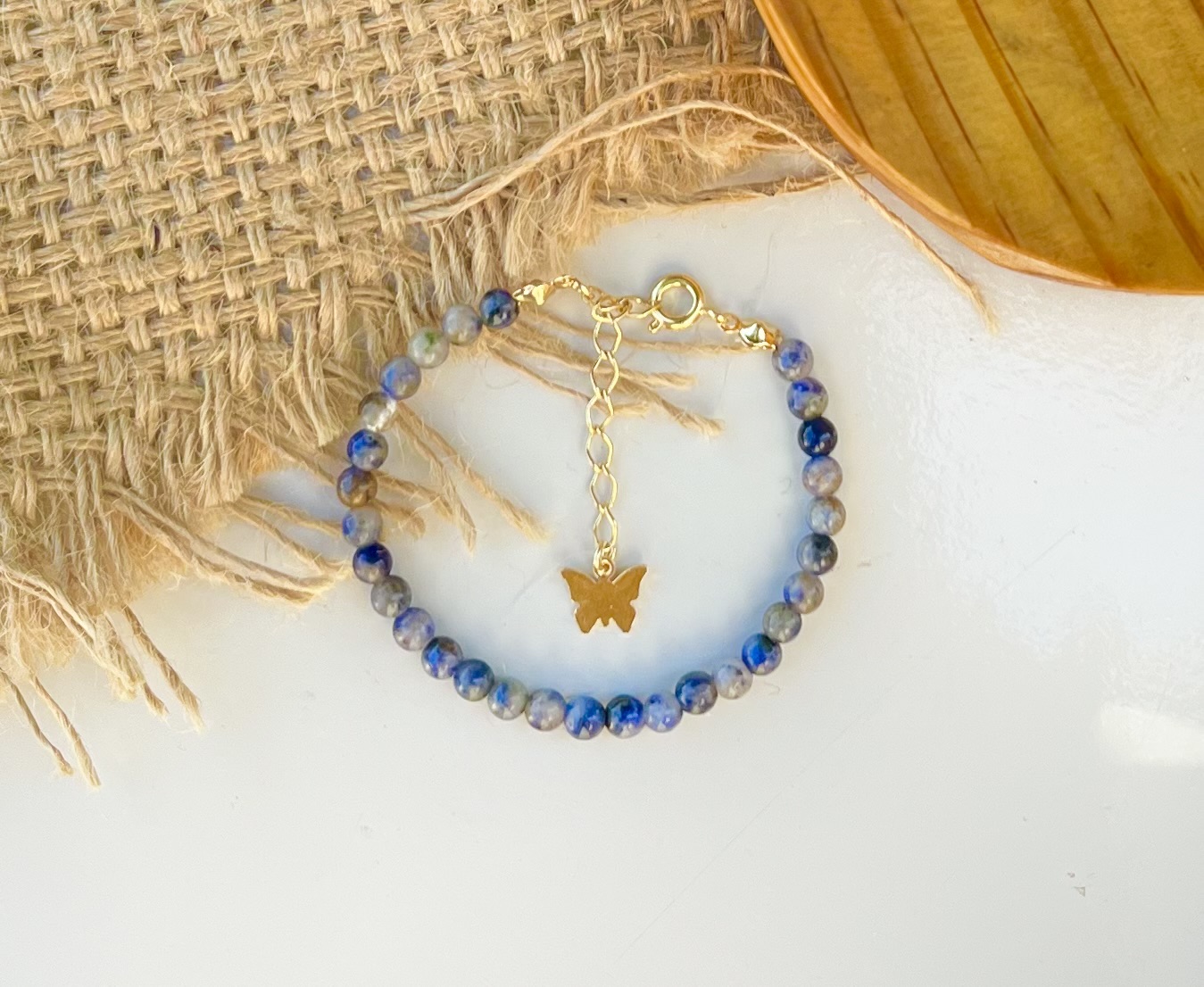 Pulseira feita com Cristais Naturais de Sodalita. Com regulagem ajustável banhada a Ouro e detalhe de borboleta na pontinha. Esferas de 4mm.