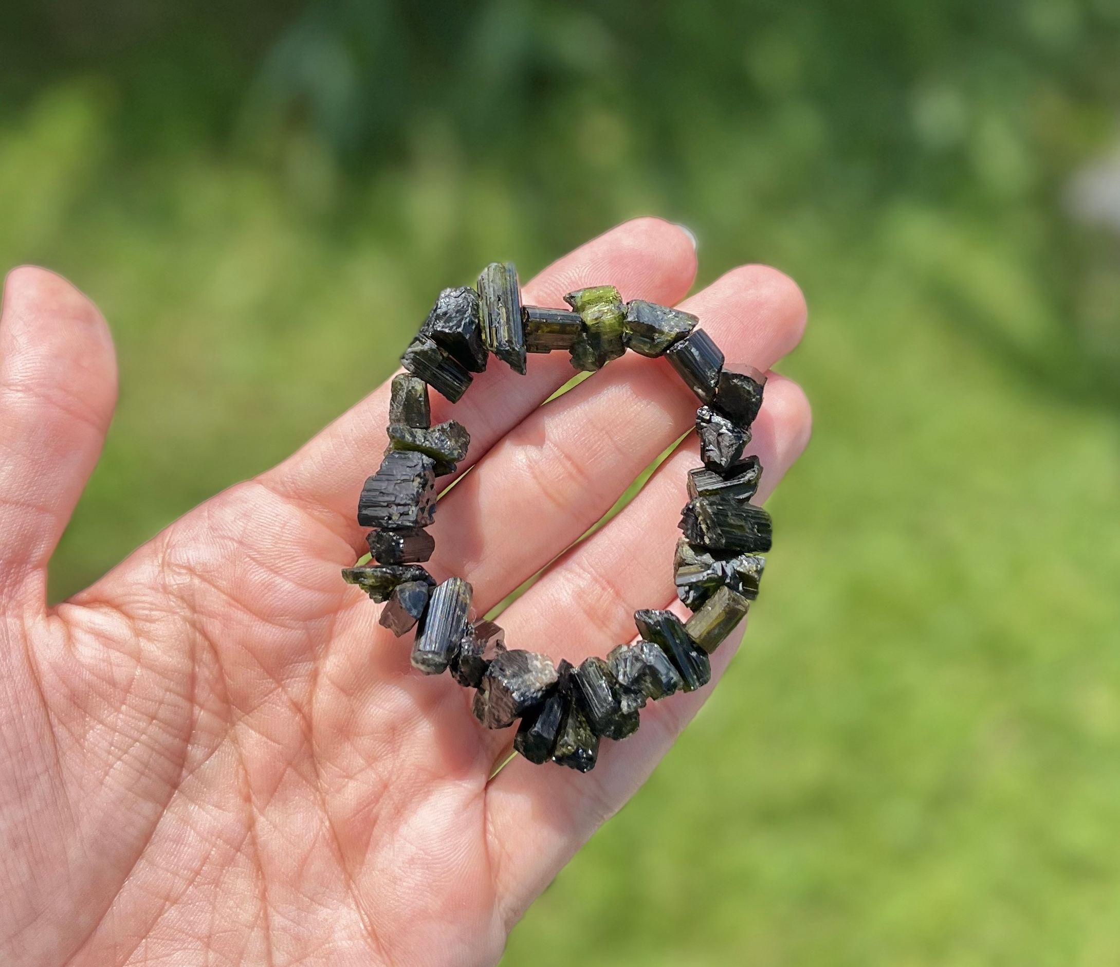 Pulseira de elástico toda feita com Cristais Naturais de Turmalina Verde. Super resistente.