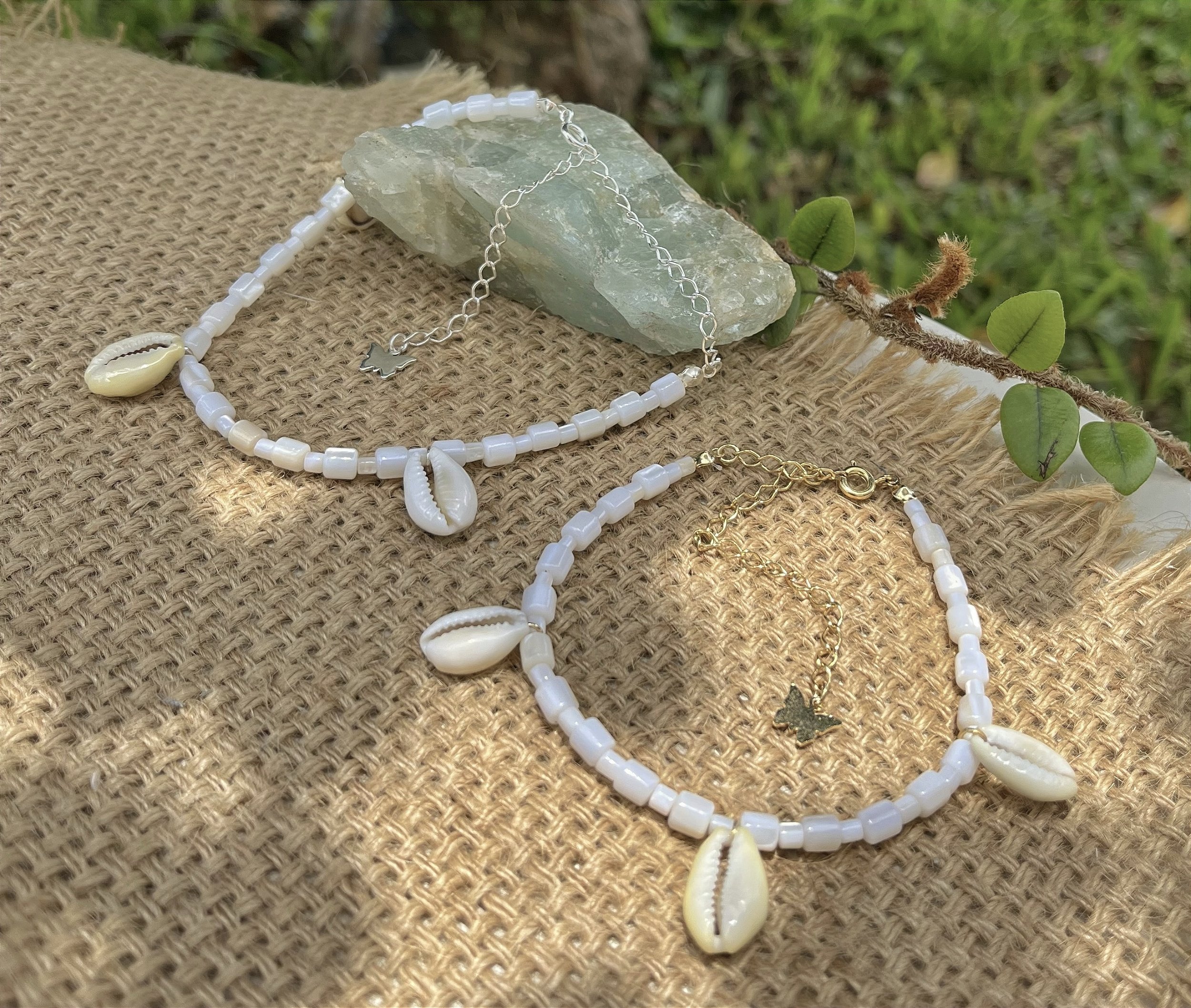 Tornozeleira toda feitinha com Madrepérola e Búzios naturais. Super delicada!! Possui regulagem ajustável na opção banhada a prata ou a ouro, como mostrado nas fotos, só escrever na descrição do pedido qual você prefere, ou iremos separar conforme disponibilidade!